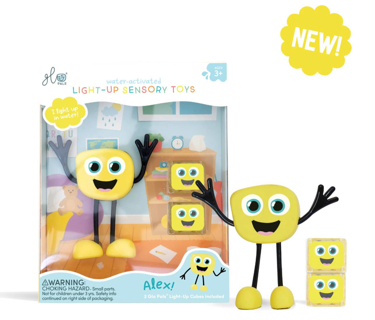 Insert your Glo Pals Light-Up Cube into the back of each Pal, drop it in the water, and watch it light up! Featuring bendable arms and colorful personalities, each Pal proudly illustrates the uniqueness in every child! Alex comes with two Glo Pals Light-Up Cubes included in the box!