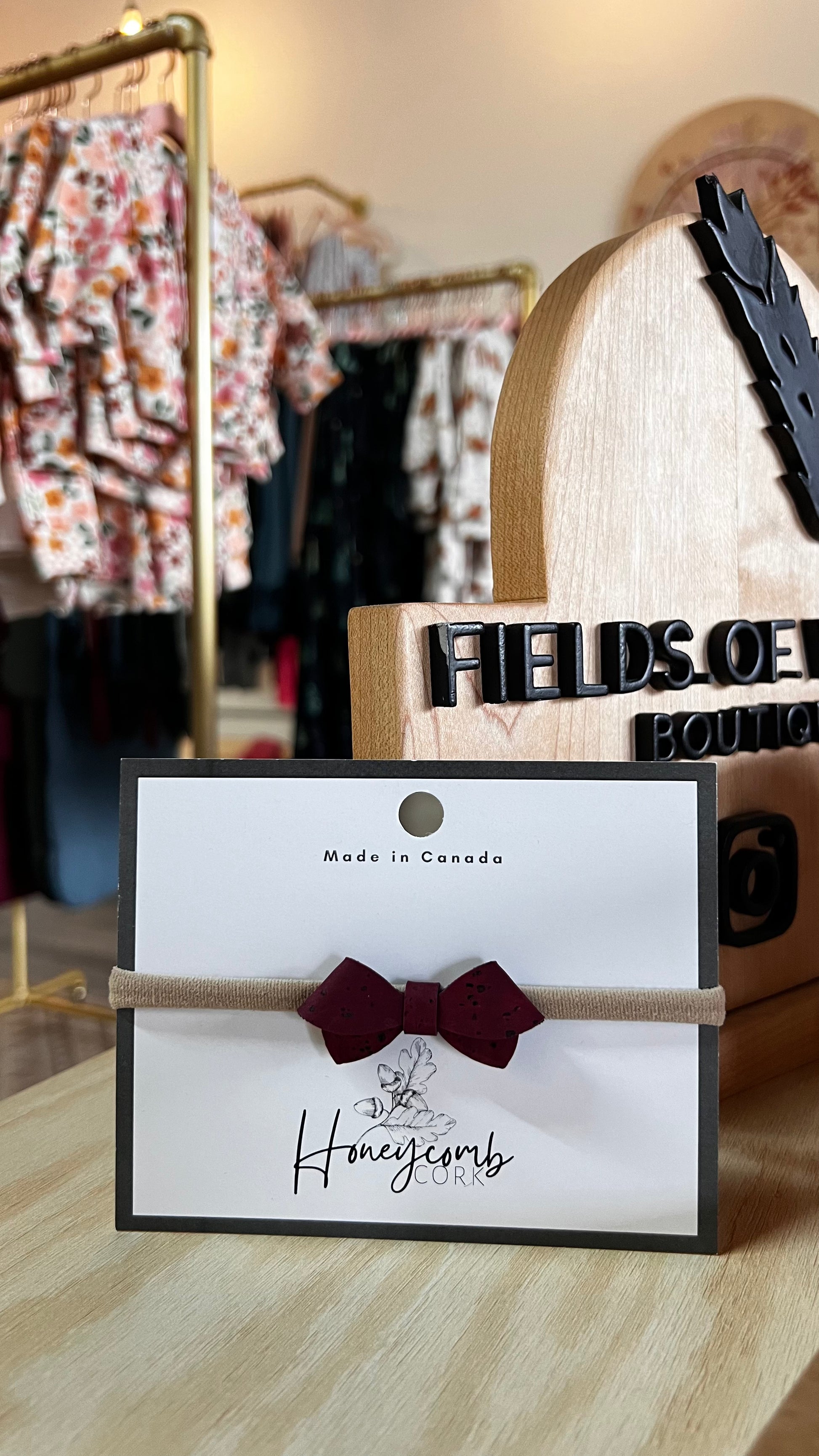 The bows contain a small clip. Honeycomb Cork products are not intended to be used as a toy or without supervision. All products are handmade in Canada using 100% Portuguese cork. Pattern placement, colour and grain will vary and be unique to each item made!