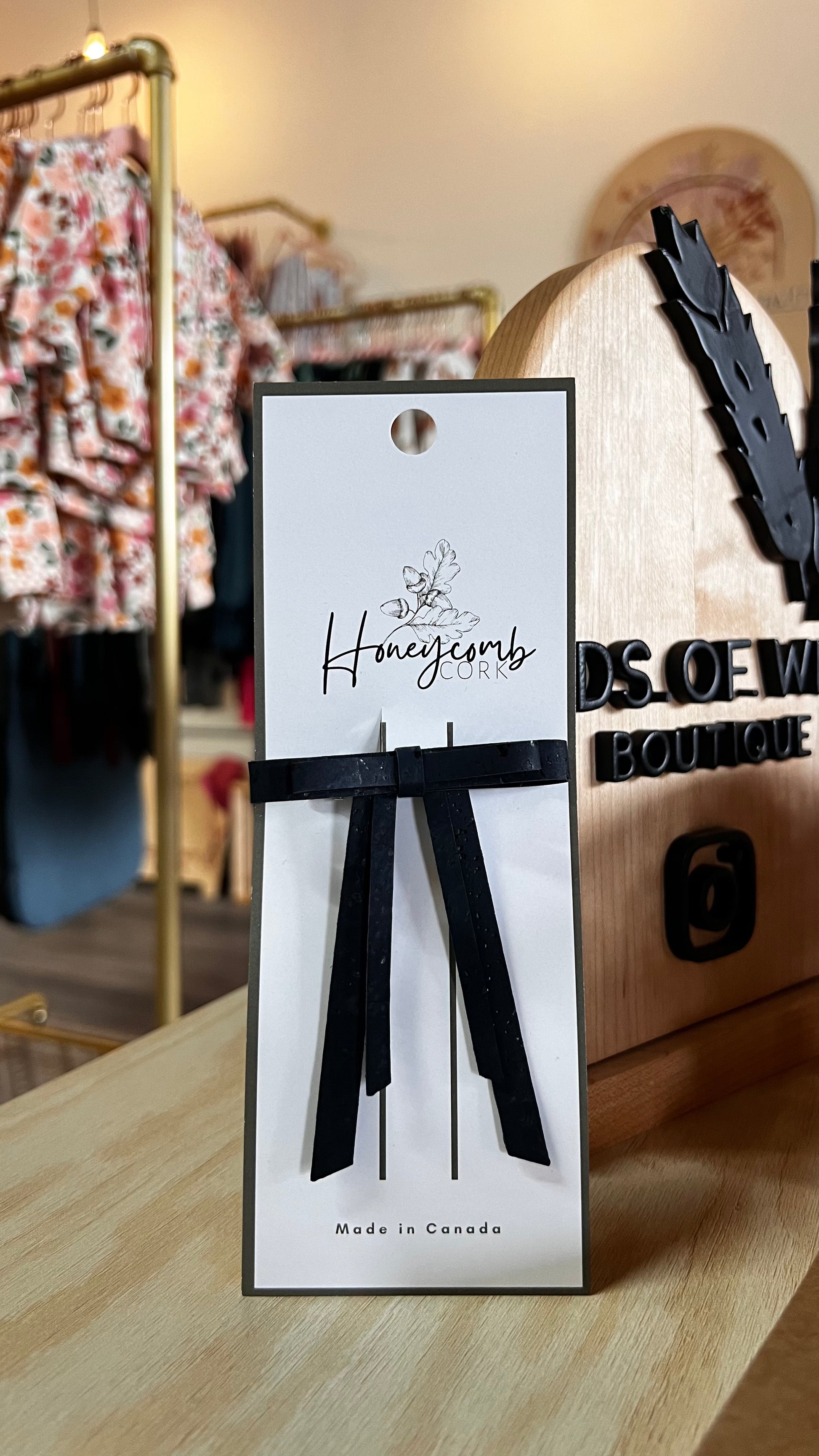 The bows contain a small clip. Honeycomb Cork products are not intended to be used as a toy or without supervision. All products are handmade in Canada using 100% Portuguese cork. Pattern placement, colour and grain will vary and be unique to each item made!