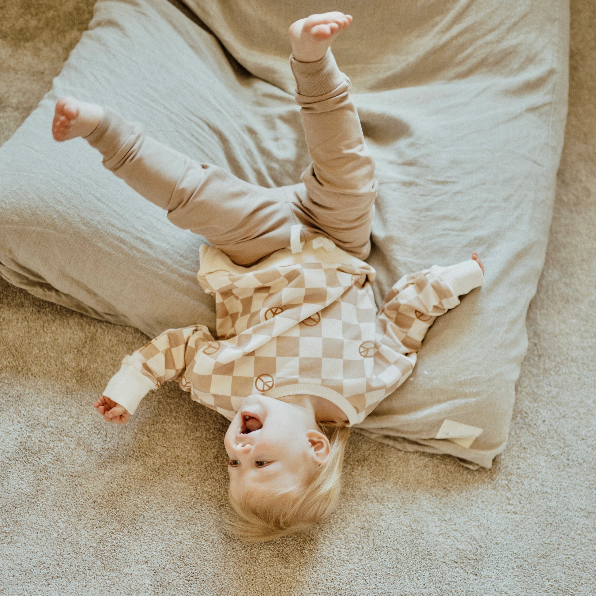 Our best selling crewneck features the sweetest checker and peace sign print, in different neutral shades. This is the perfect piece for any occasion! Our adorable mix and match pieces are timeless featuring neutral tones, prints and lightweight fabric!